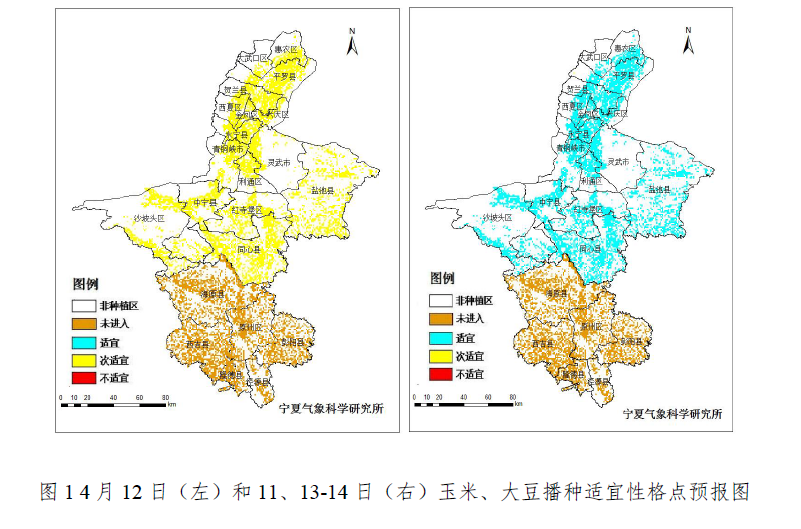 10-13日的降温和大风沙尘天气,会对未出苗的春小麦造成不利影响,12日最低气温降至-5~-2℃,可能会对已出苗小麦产生轻~中度霜冻。根据春耕春播农用天气预报等级指标分析,由于12日温度下降,灌区玉米、大豆播种适宜度为次适宜。另外,未来四天多大风沙尘天气,会影响播种工作的正常开展。