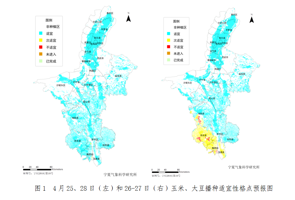 根据春耕春播农用天气预报等级指标分析,4月26-27日海原县及固原市有阵雨或小雨,玉米和大豆播种适宜性等级为次适宜,其他地区及时段为适宜等级(图1)。另外,26日有大风沙尘天气,会干扰播种工作的开展。
