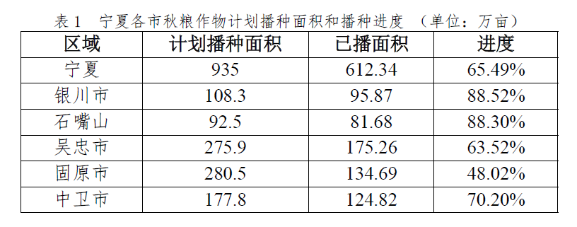 根据成人直播 厅农情调度数据,截至5月7日,全区已播秋粮作物612.34万亩,播种进度65.49%。其中银川市播种进度88.52%,石嘴山市88.30%,吴忠市63.52%,固原市48.02%,中卫市70.20%(表1)。